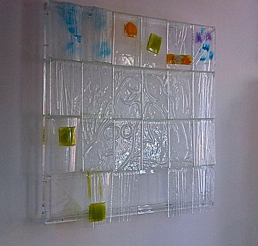 Déjeuner sur l'herbe en verre composé d'un assemblage de tuiles de verre montées sur filins cadre plexi .